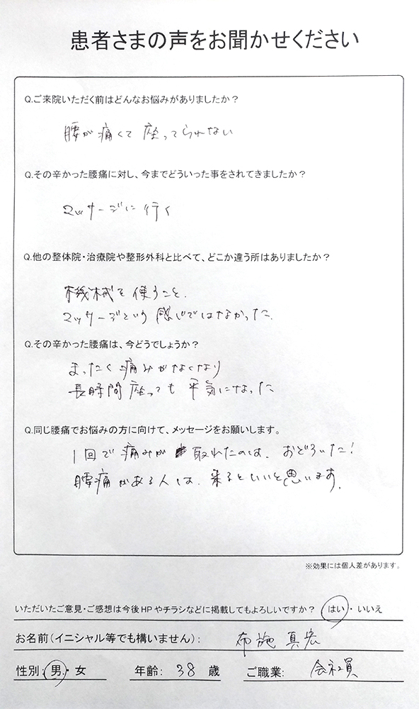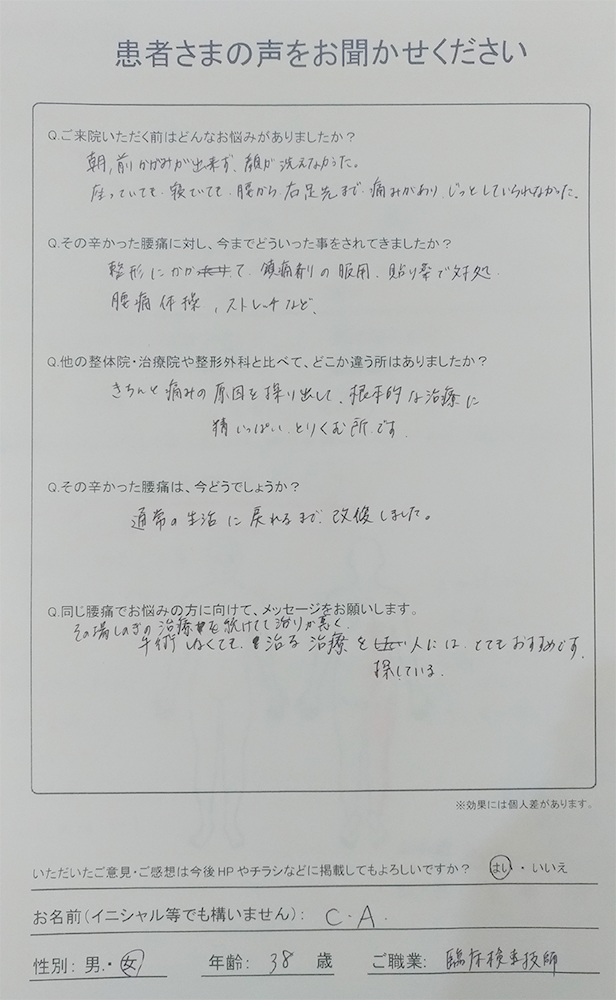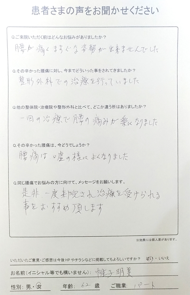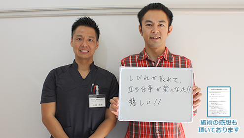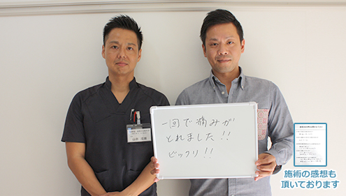 ぎっくり腰はその日のうちに痛みが90%以上緩和され、寝返りも苦にならなくなりました。