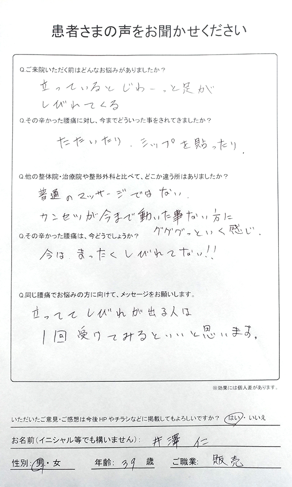 立っててしびれが出る人は1回受けてみるといいと思います。