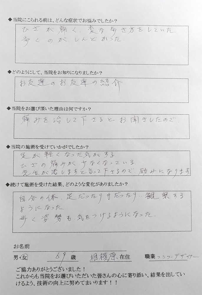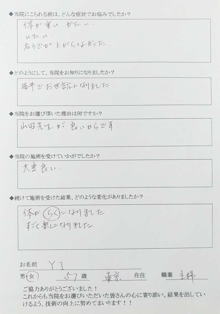 近所の同じ症状に悩んでいた知人に山田先生を紹介してもらった(症状が改善したと聞いた)