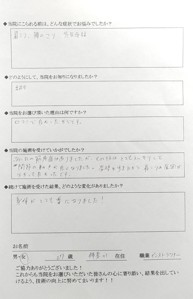 細かやな説明を元にどうしてその部分に痛みが出ているのかを解明していただけるので、定期的に気になるところを施術していただいています。