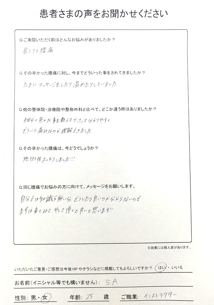 長年悩んでいた腰や姿勢をどのようにしたら良いのかを理解できたので、普段の姿勢を意識するようになりました。