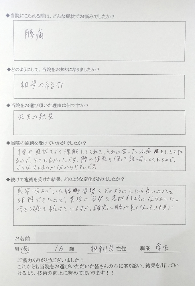 15年前から腰痛や坐骨神経痛の症状が出たりしていた時、ぎっくり腰になり来院しました
