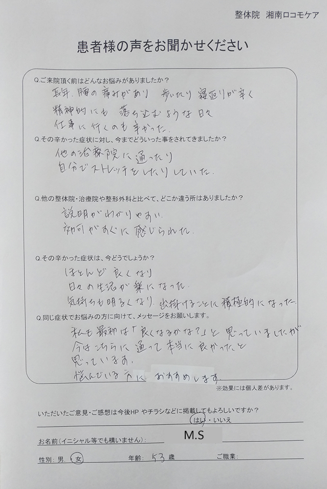 長年、腰の痛みがあり歩いたり寝返りが辛く、精神的にも落ち込むような日々。仕事に行くのも辛かった。
