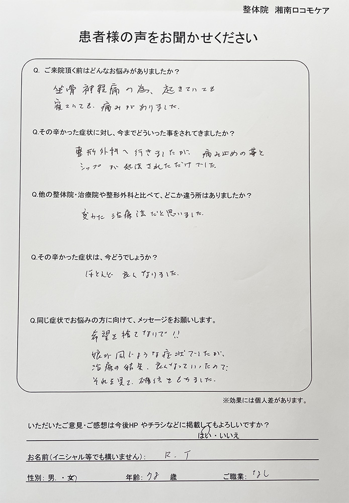 坐骨神経痛の為、起きていても寝ていても、痛みがありました。